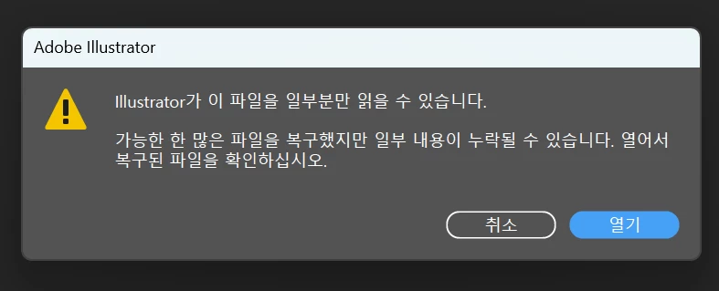 일러스트레이터 파일이 갑자기 파일의 일부분만 읽을 수 있습니다. 파일중 일부가 누락되었을수도 있습니다. 이런게 뜨고 ai 파일이 pdf로 변환되어 나옵니다.