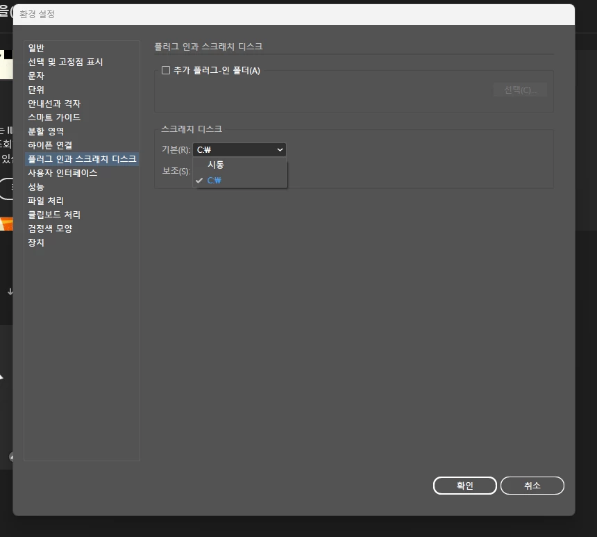 Edit(편집) - Preference(환경 설정) - Plug-in and Scatch Disk (플러그 인과 스크래치 디스크)