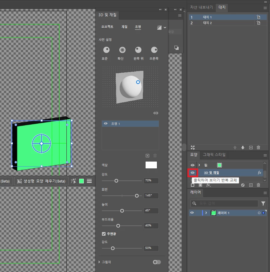Classic 3D 효과에서는 미리보기 on/off가 가능했는데, 새롭게 생긴 3D 효과에서는 미리보기 On/off 기능이 없는 것 같네요. 대신 속성 패널의 눈표시로 효과 숨기기가 가능합니다. 그러면 효과가 적용된 상태가 아닌 원본 도형의 형태를 확인 할 수 있어요.