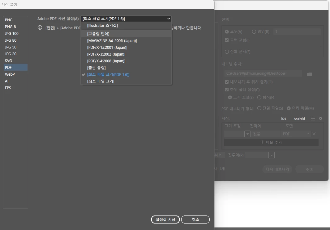 최초 PDF파일을 저장할때 '화면에 맞게 내보내기' 이후 PDF로 설정하고 우상단에 작은 톱니바퀴를 눌러서 서식 설정 창이 열리고 좌측에 PDF를 눌러주신다음 'PDF사전 설정'을 '고품질로 인쇄'를 진행시에도 동일하셨을까요?