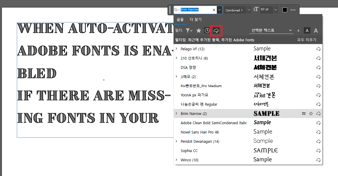 이래 하단의 그림처럼 구름 모양을 클릭 > 다운로드한 전체 어도비폰트를 확인할 수 있습니다.