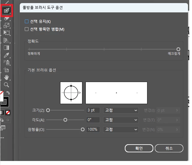 물방울 브러쉬 도구를 더블클릭하면 아래와 같이 도구 옵션창에서 조절할 수 있습니다.