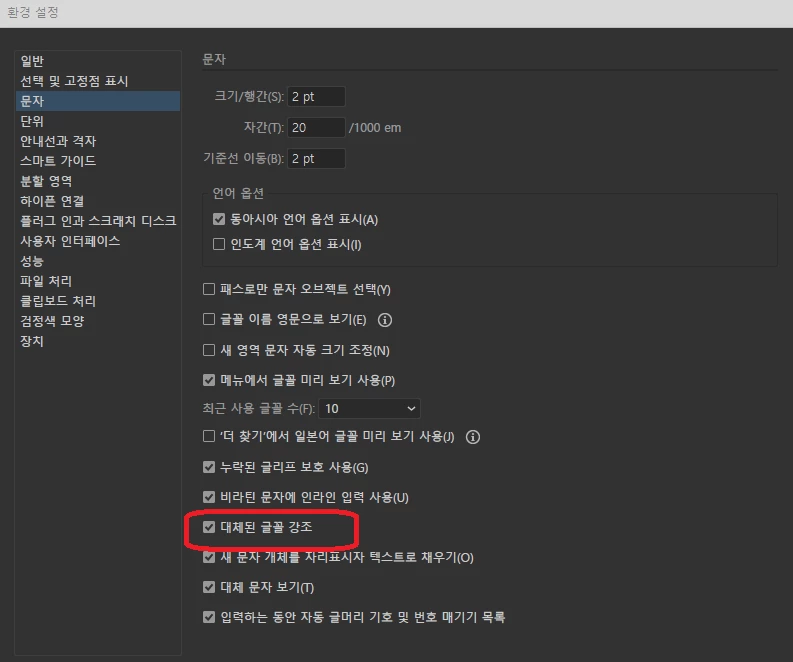 일러스트에서 서체 유실시 나타나던 분홍색 표시가 안보여요?