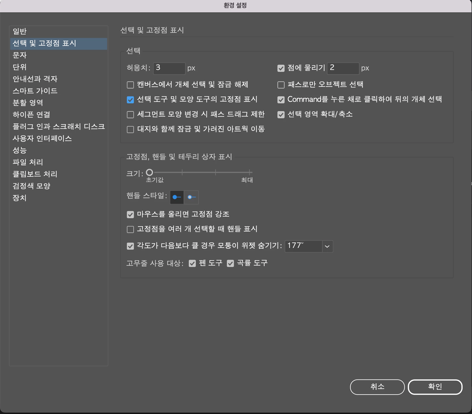 2. 환경설정 > 선택 및 고정점 표시 > 선택 도구 및 모양 도구의 고정점 표시 (체크)