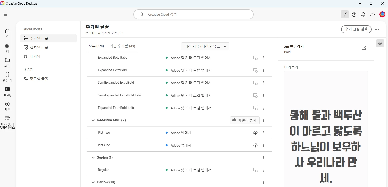 확인해봐도 폰트는 멀쩡하게 다운받아져 있는데 다시 키면 누락됩니다. 어도비 폰트에서 같은 폰트 제거 후 다시 설치하면 적용이 되는데