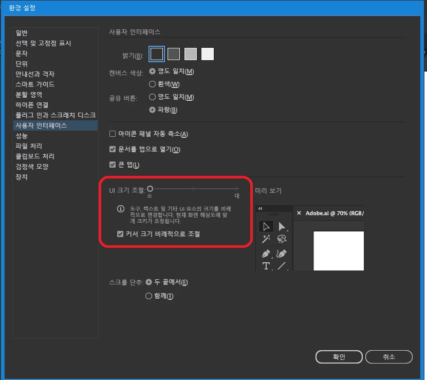 편집 > 환경설정 > 사용자 인터페이스 > UI크기 조절을 통해 전체적인