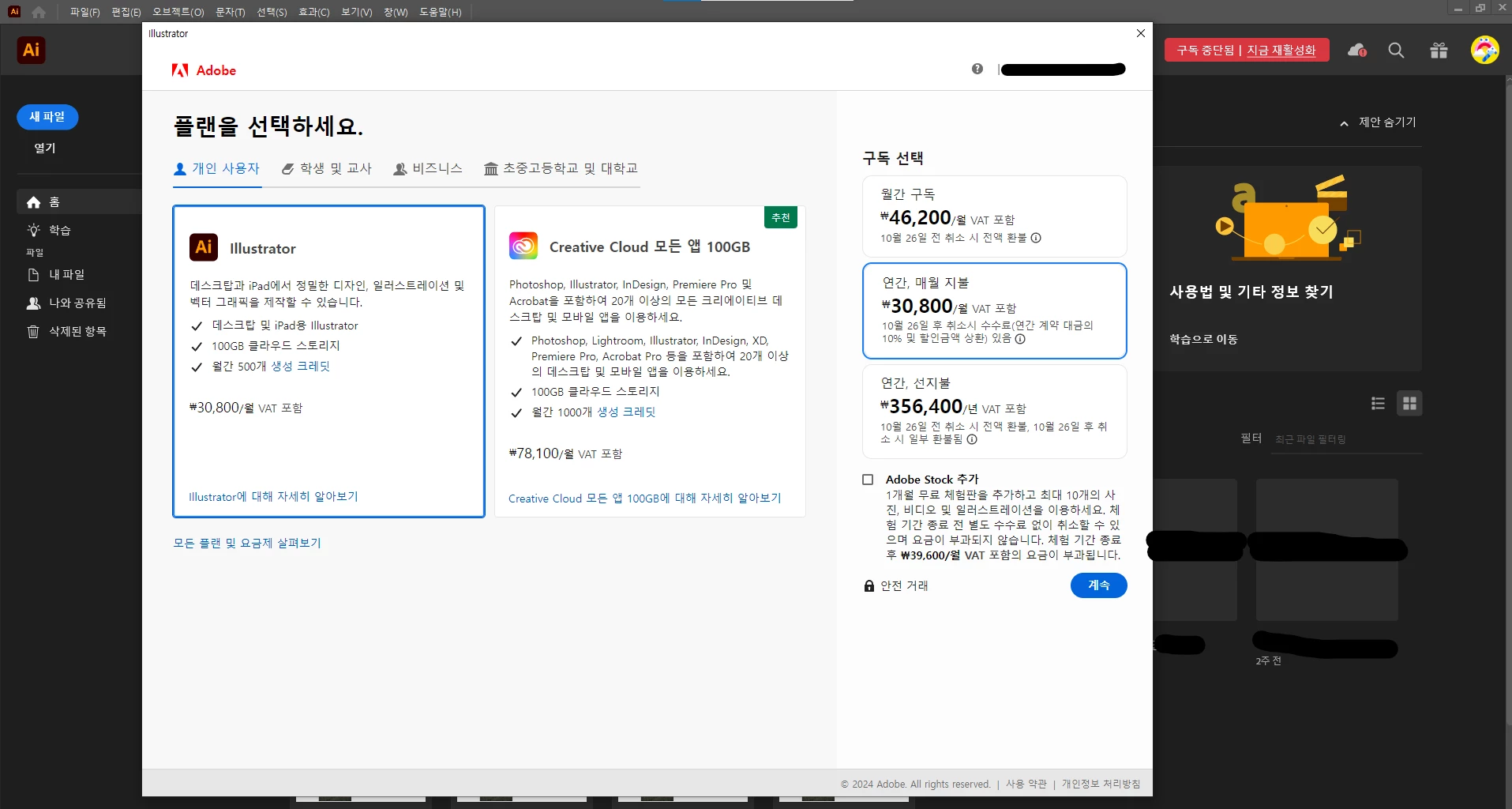 일러스트 월정액 구매 했는데 실행 오류