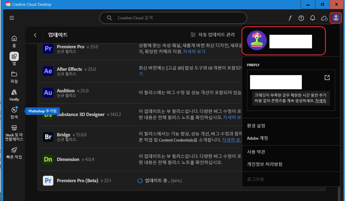 프로그램 종료 후 Creative cloud 데스크탑을 실행한 뒤