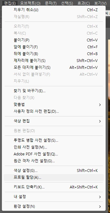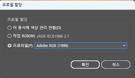 색상설정 뿐만 아니라 프로필 할당도 함께 어도비 RGB로 변경해 보시겠어요?