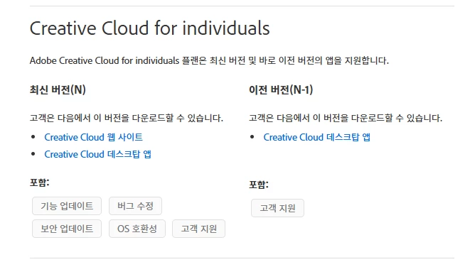 Adobe Creative Cloud for individuals 플랜은 최신 버전 및 바로 이전 버전의 앱을 지원합니다.