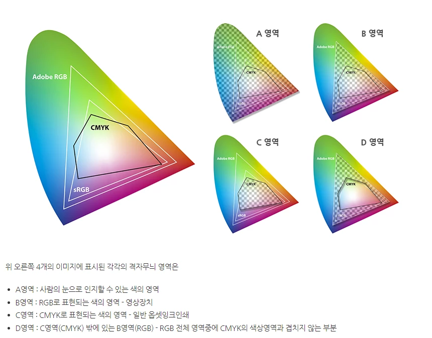 잉크 인쇄를 고려한 CMYK는 디지털 디스플레이의 RGB 색상을 100% 동일하게 표현 할 수 없습니다.