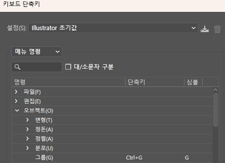 단축키 내 ctrl+G 명령어 삽입되어있으나 , ctrl+G 키보드 버튼 입력에는 그룹화가 작동되지 않습니다.