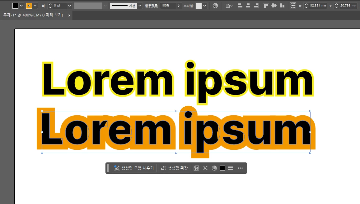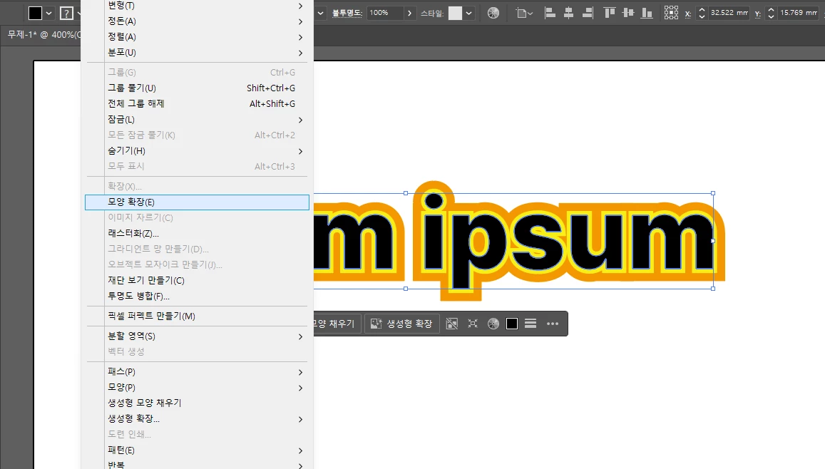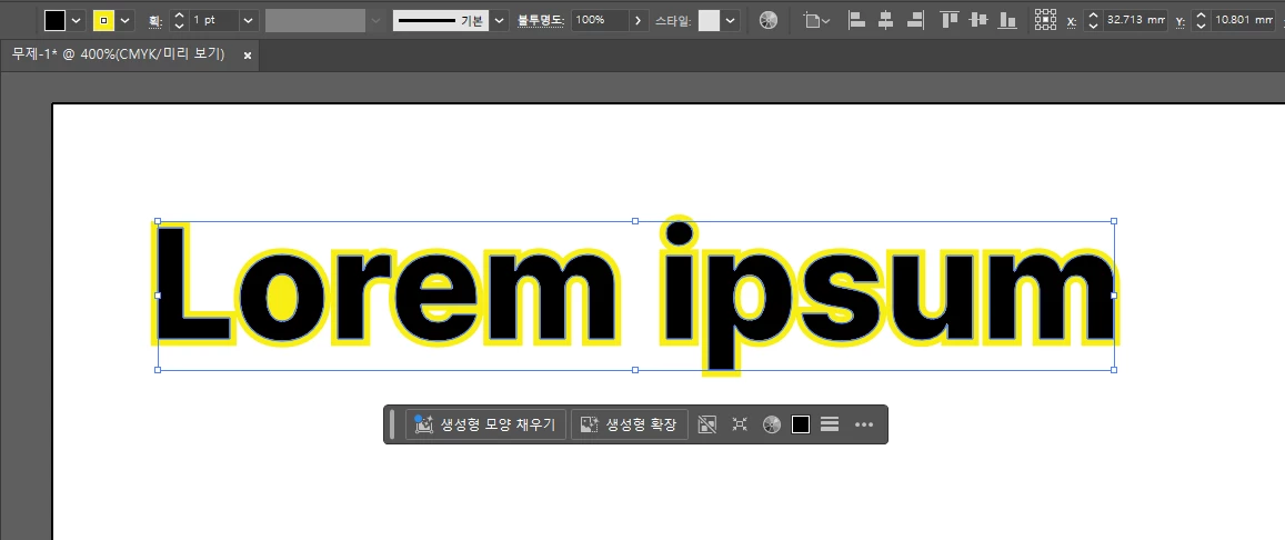우선, 텍스트를 입력 후 우클릭해 [ 윤곽선 만들기 ] 기능으로 텍스트가 아닌 윤곽선이 있는 패스로 전환을 진행해 주세요!