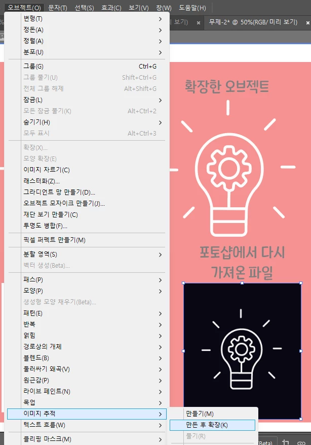 이렇게 해당하는 오브젝트 선택후 > 오브젝트> 이미지 추적> 만든후 확장을 해보시는게 좋을 것같고
