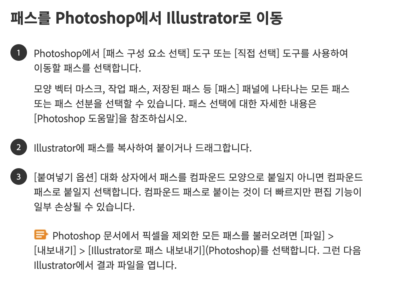 일러스트에서 포토샵으로는 붙여넣기가 됩니다.