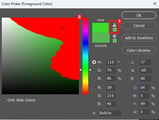 Gamut Waring 기능을 사용하지 않을 때에는 붉은 박스 영역(그림의 1번)에서 경고 아이콘이 발생하여, 확인 할 수 있습니다.