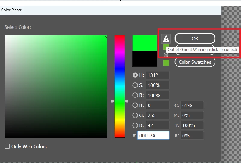 하지만, Color 패널에서 아래와 같이 경고 아이콘으로 표현할 수 없는 색상임을 알리고 있습니다.