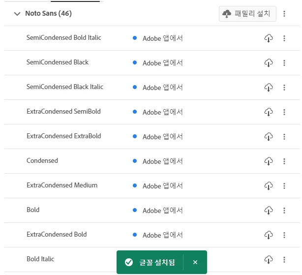 한번 크리에이티브 클라우드 데스크톱을 열어 폰트 메뉴로 이동해서 noto sans  폰트의 패밀리 설치를 진행해 보시겠어요?