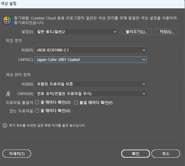 하단의 색상관리 정책을 맞춰주는 편입니다.