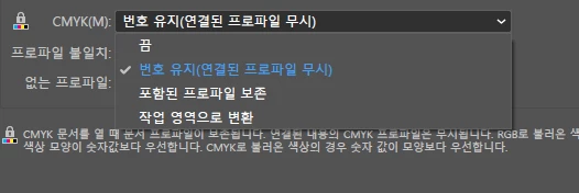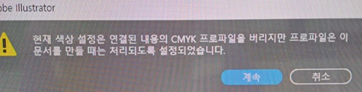 '현재 색상 설정은 연결된 내용의 CMYK 프로파일을 버리지만 프로파일은 이 문서를 만들 때는 처리되도록 설정되었습니다'