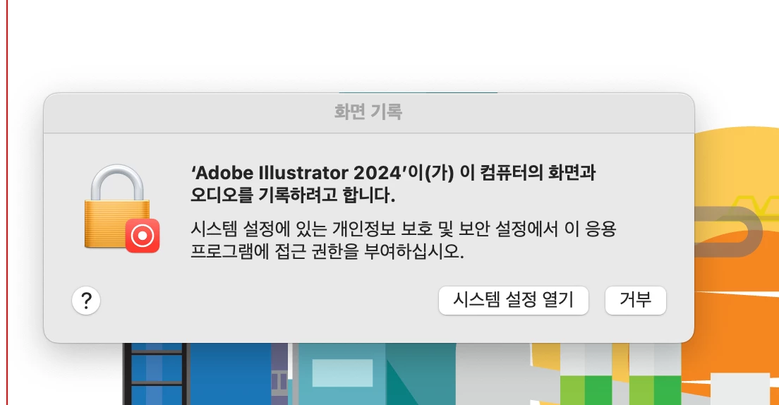 따라서 일러스트에서 화면을 녹화한다는 안내가 나오는 경우 거부를 클릭하여 무시할 수 있습니다. 다만 스포이드 도구를 사용하는 데 있어 영향을 미칠 수 있습니다. 해당 안내문구에 대한 승인을 진행하더라도 화면을 녹화하지는 않으며,  폴더에 대한 접근 권한만 변경됩니다.  즉, 해당 안내창이 나오는 경우 권한을 승인하거나 거부하시는 방법으로 진행하면 해결됩니다.