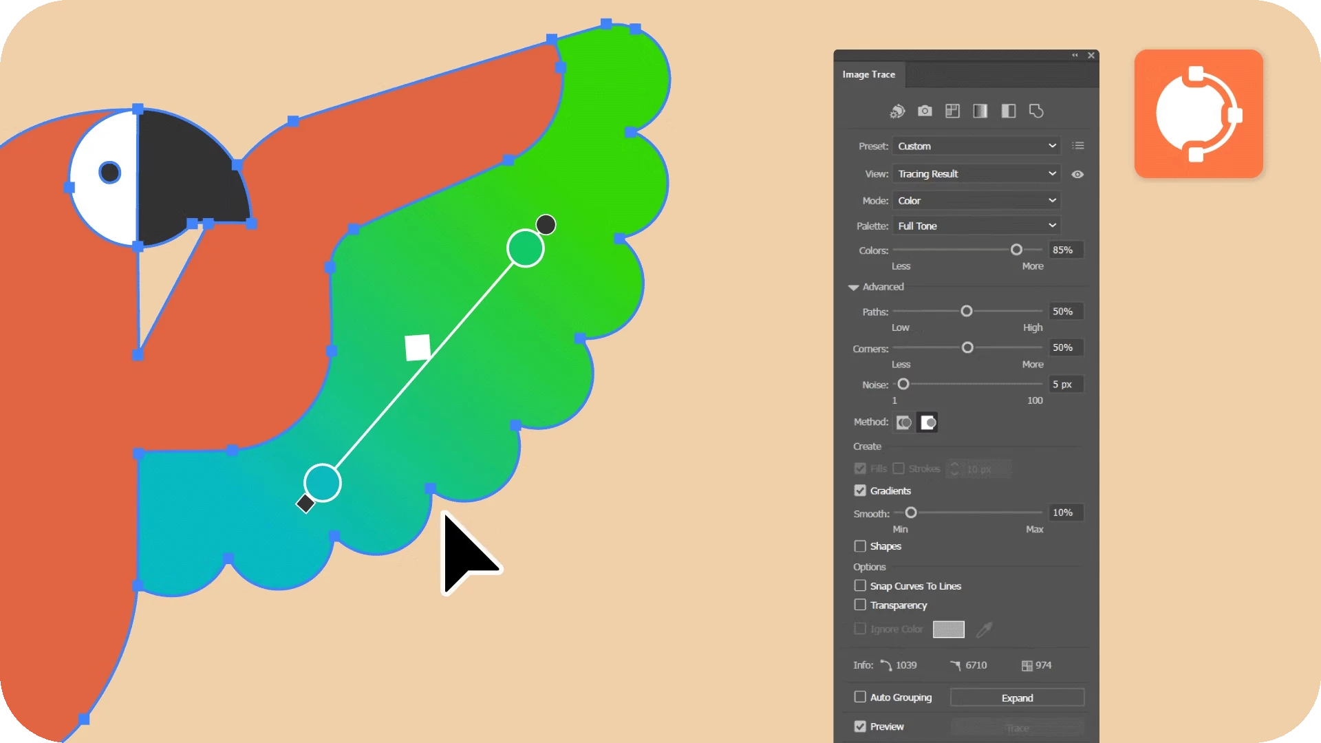 일러스트의 향상된 이미지 추적 기능은 이제 개선된 곡선으로 이미지를 추적하고, 앵커 포인트가 적고 자동 그룹화가 편집을 |