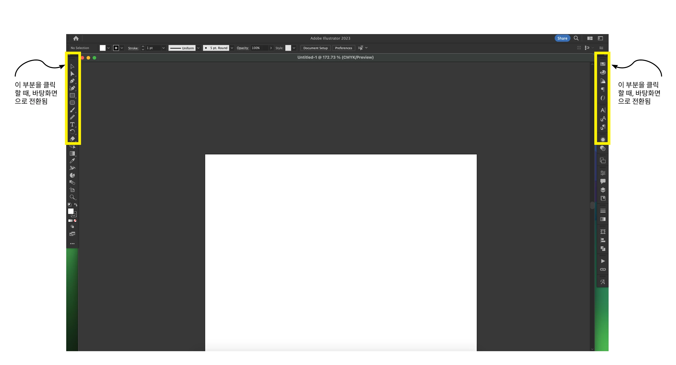 Illustrator 28.0에서 Application frame을 사용하지 않을 때 왼쪽 툴 바와 오른쪽 툴에서 세부 툴을 클릭하면 툴 선택이 불가능하며 동시에 바탕화면으로 전환됩니다.