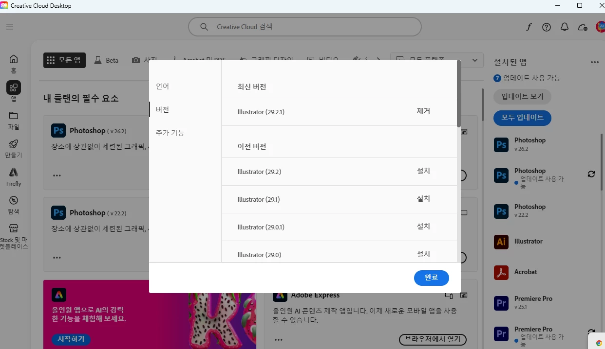 최신버전 29.2.1버전을 이용중이 시라면 크리에이티브 클라우드를 통해 29.1버전으로 업데이트를 롤백 설치를 진행해 해보시겠어요?