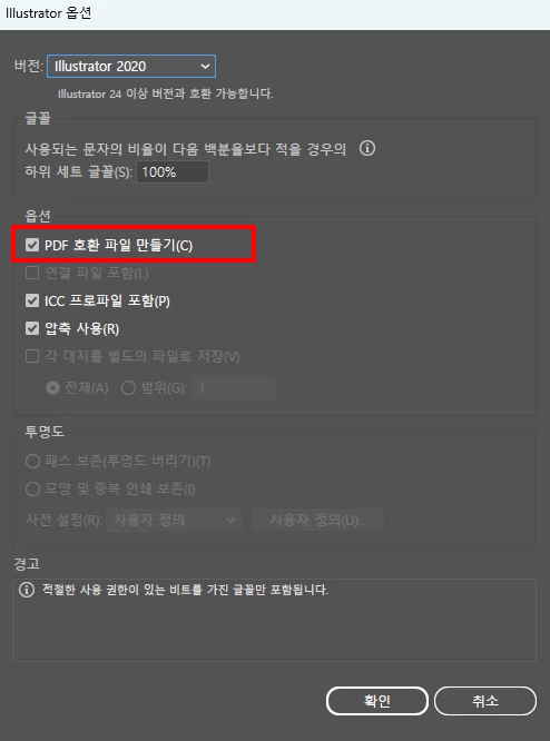 'pdf 내용이 포함되지 않은 상태로 저장된 adobe® illustrator® 파일입니다' 오류 문의드립니다.