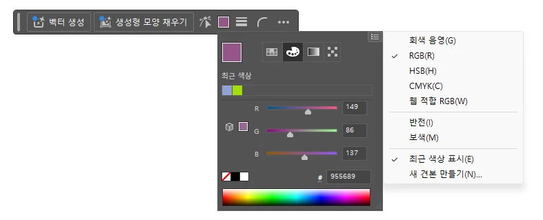 RGB 모드로 사용하는데 개체 색상 조절하려는데 저렇게 경고문 뜨고 조절할 수 있는 버튼도 사라지고...경고문을 누르면 CMYK로 바뀌고 왜 이러는 걸까요 RGB모드에서는 RGB 색상만 사용하고싶은데 해결방법 알려주세요!