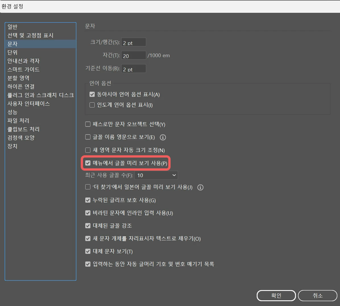 ☑ 메뉴에서 글꼴 미리 보기 사용 (Enable in-menu Font Previews)