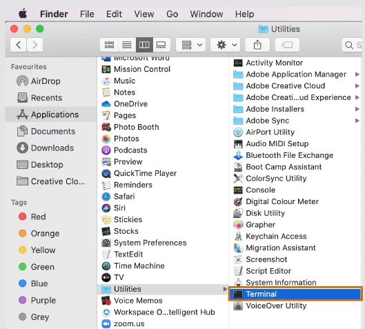 애플리케이션Applications - 유틸리티Utilites - 터미널Terminal 실행