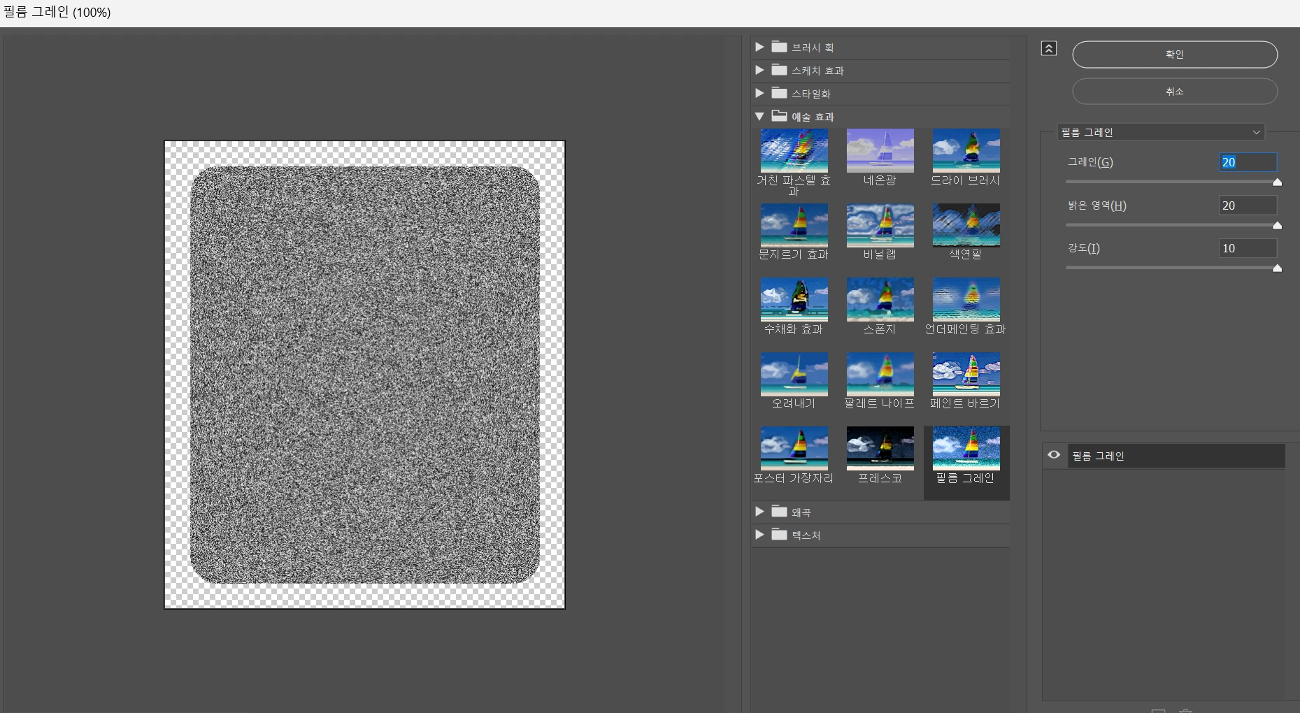 모양 패널에서 그레인 효과가 적용된 칠의 모드 및 불투명도를 변경해 주세요.