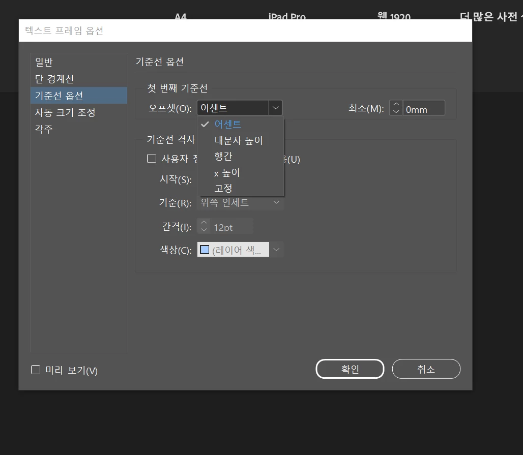 기준선 옵션 설정 사라짐
