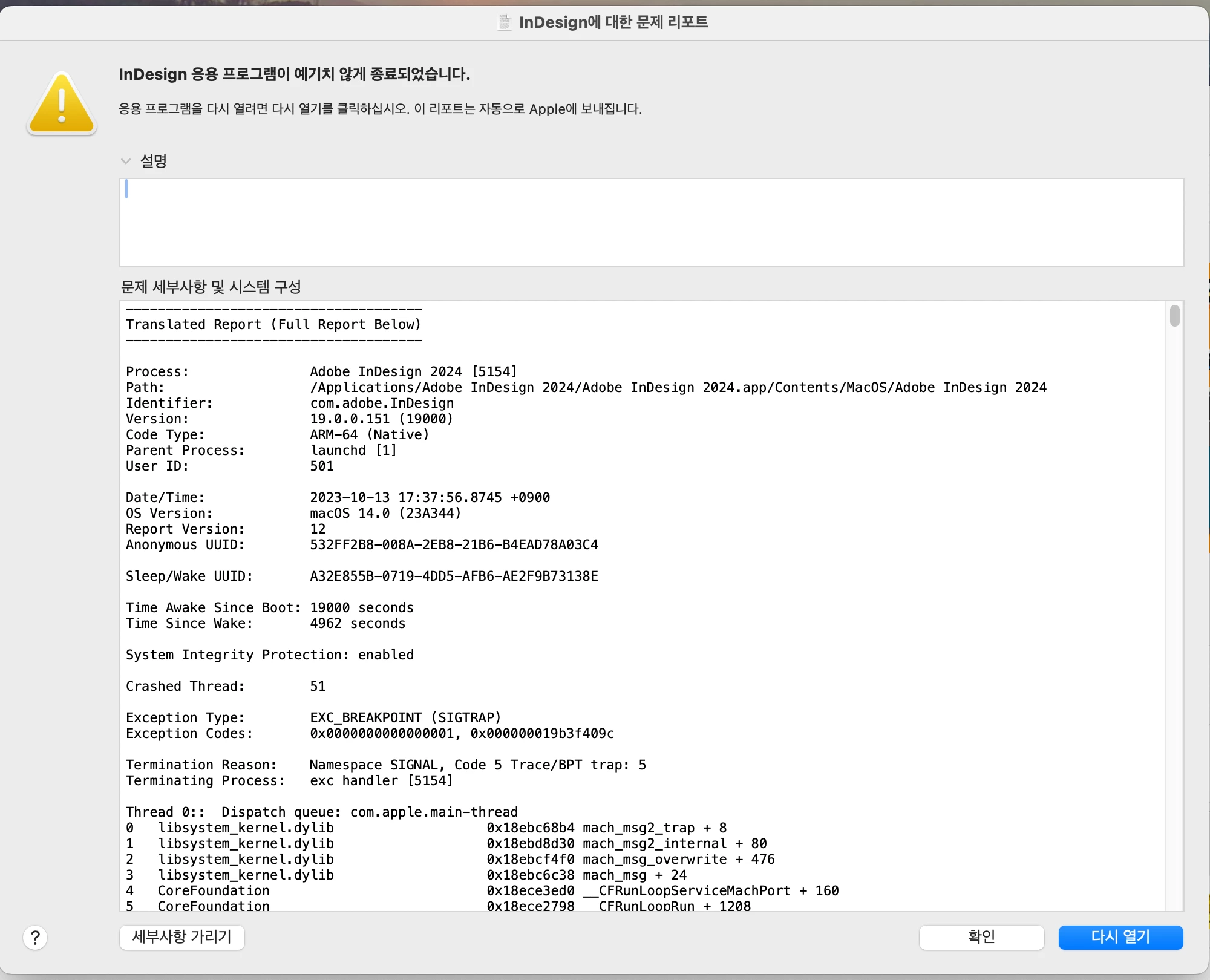 150페이지 200페이지 디자인을 작업하고pdf로 변환시 아주 자주 팅기는 현상이 자주 일어납니다. 2024로 업데이트 하고 나서부터 일어나는 현상입니다. 2023까지도 pdf 변환시에 팅기는 현상은 없었습니다. 인디자인을 지우고 다시 설치했는데도 마찬가지입니다. 이 글을 개시하는 중에도 pdf 변환하다가 또 팅겼네요.