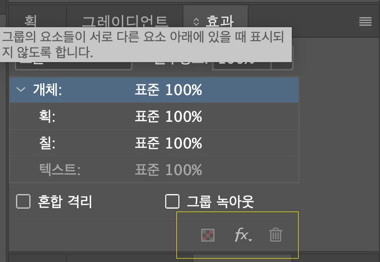 색상이 이미지(일러스트 포함)에 적용되어 있는 경우 캡쳐 이미지처럼 비활성되는 경우가 있습니다.