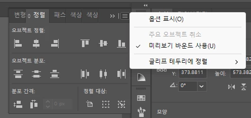 아니시면 한번 정렬창을 열어서 미리보기 바운드 사용을 체크 해재해 보시겠어요?