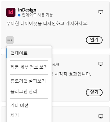 크리에이티브 클라우드를 열어 인디자인 열기버튼옆 점세개를 눌러주시고, 기타버전에서 이전버전으로 롤백을 진행해 보겠습니다.