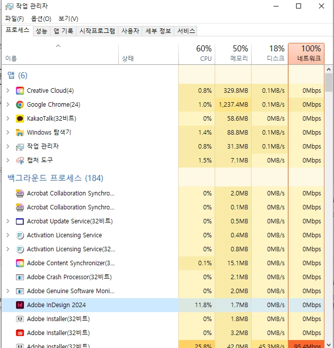 2. 사진과 같이 인디자인 재설치 이후 백그라운드 프로세스에서만 확인되고,