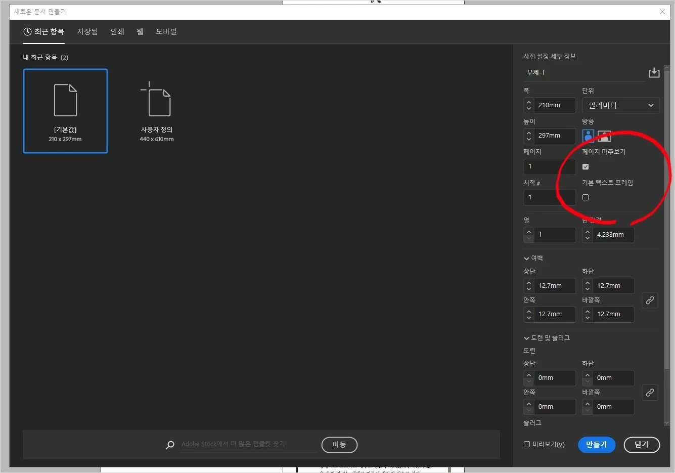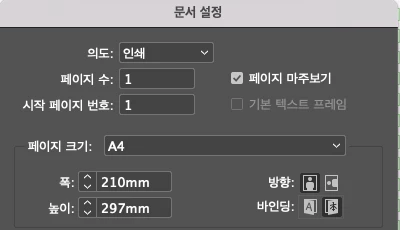 새로운 문서만들기에서 페이지 마주보기 아래쪽에 바인딩 설정체크가 가능해야하는데