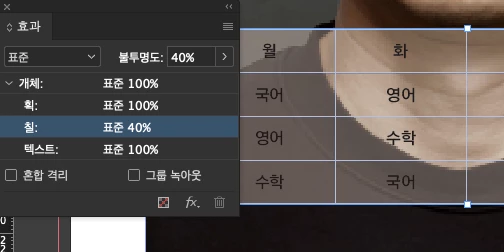 인디자인 도표 바탕색 투명도를 낮추어 뒤 그림이 보이게 할수는 없나요?