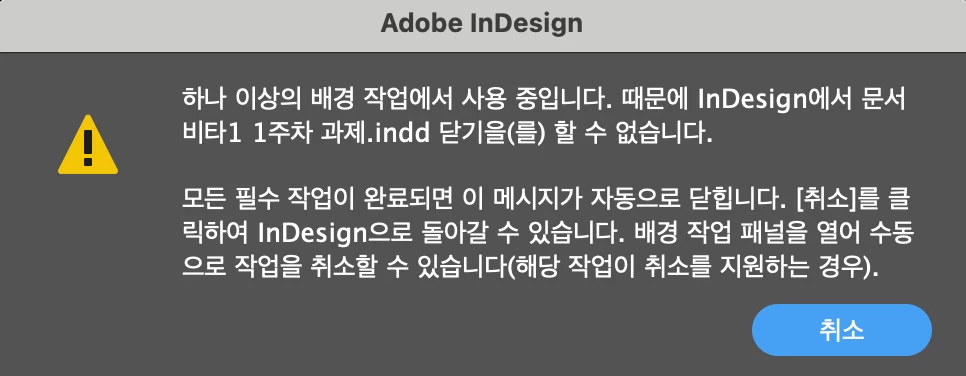 인디자인 pdf 인쇄용 내보내기를 하던 중에 처음엔 잘 되다가 수정하고 다시 내보내기를 누르니 이렇게 뜨면서 인디자인이 꺼지지도 않고 저장도 안되고 이 상태로 계속 가만히 있네요.. 어떻게 해야할까요?