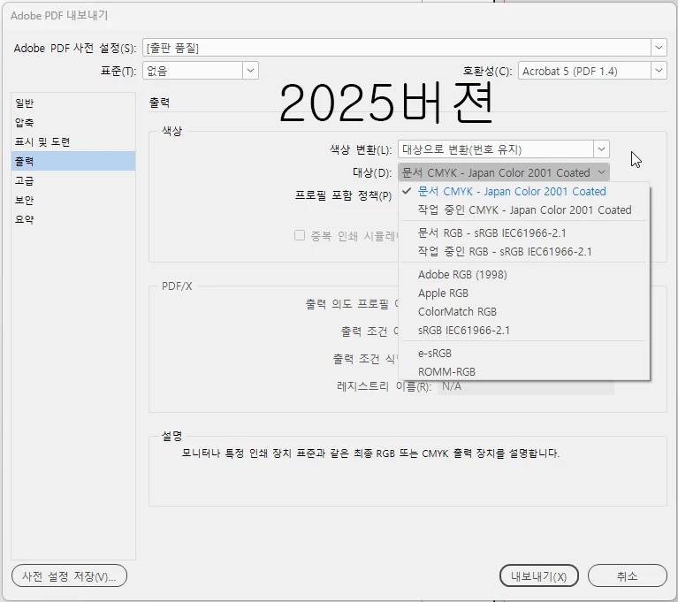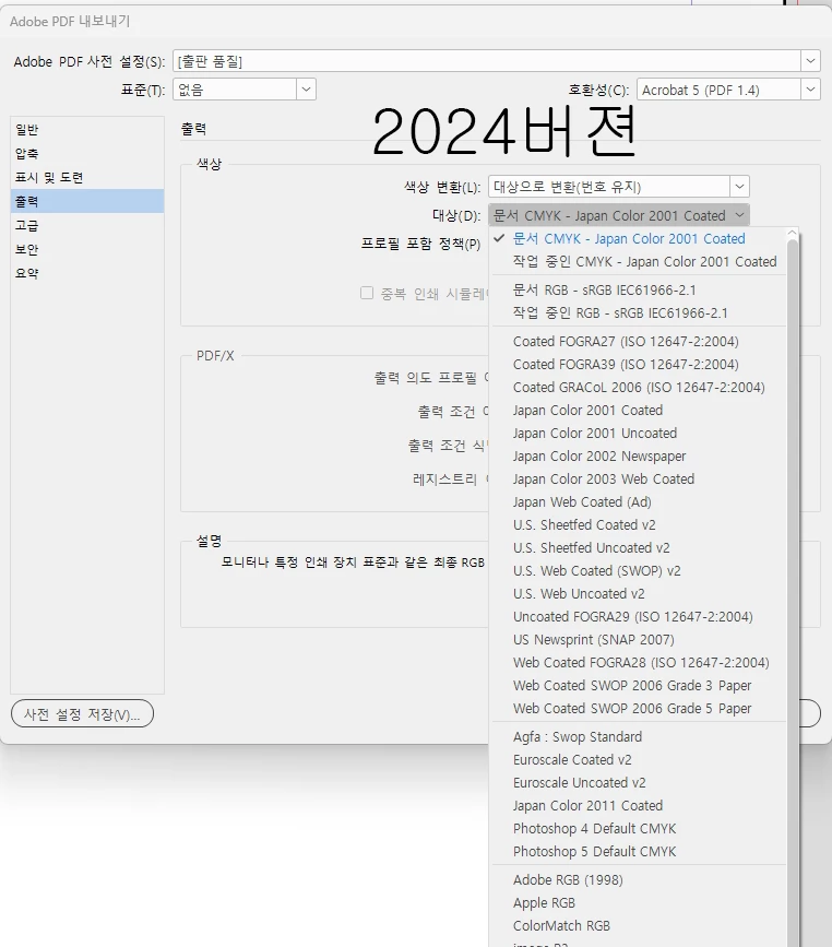 PDF출력상에 컬러 프리셋이 사라지는 것은 환경입니다.