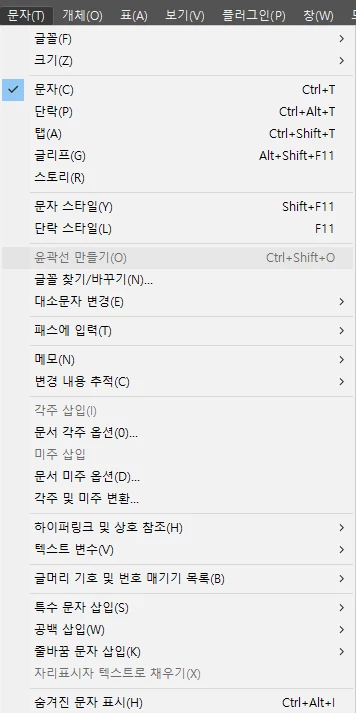 합성글꼴 사용하고 싶은데 문자 메뉴에 합성글꼴 메뉴 자체가 없습니다.