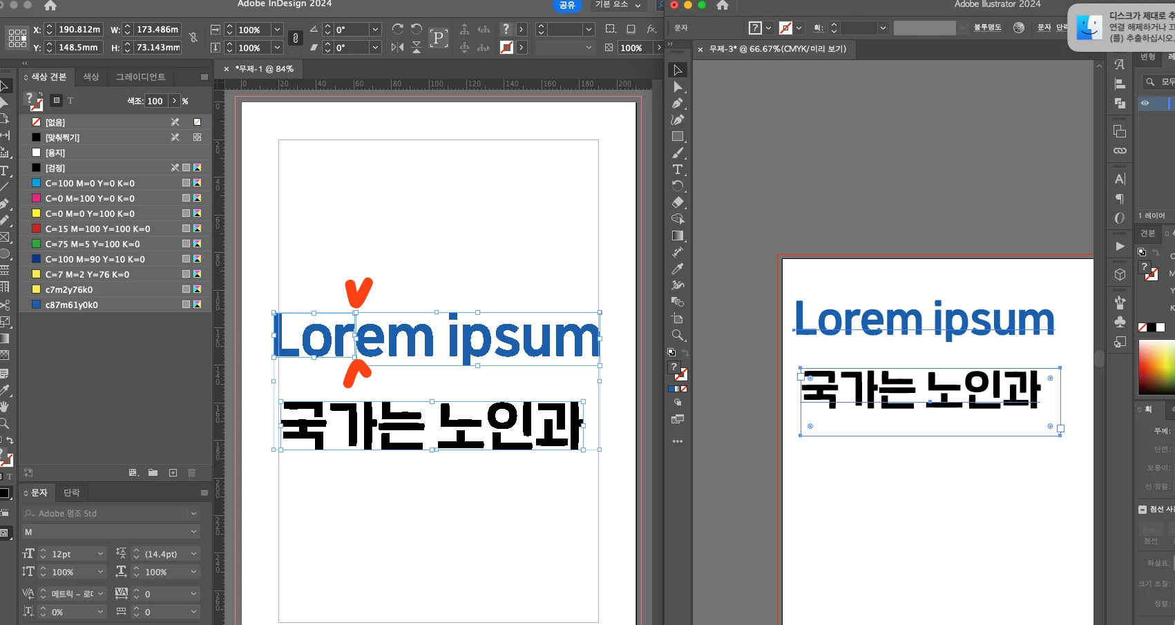 아래 이미지는 오른쪽 일러에서 왼쪽 인디자인으로 텍스트 2개 (그룹으로 묶지않은상태)를 복사 붙여넣기 한 상태입니다. 빨간색 체크처럼 완벽하게 하나로 들어오지는 않아도 레이아웃 그대로 들어오는데 저는 이게 안되더라구요.