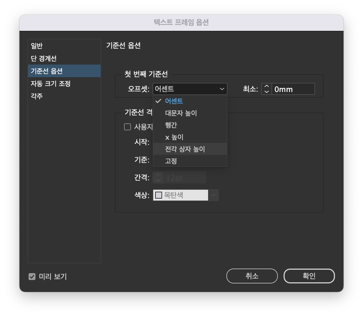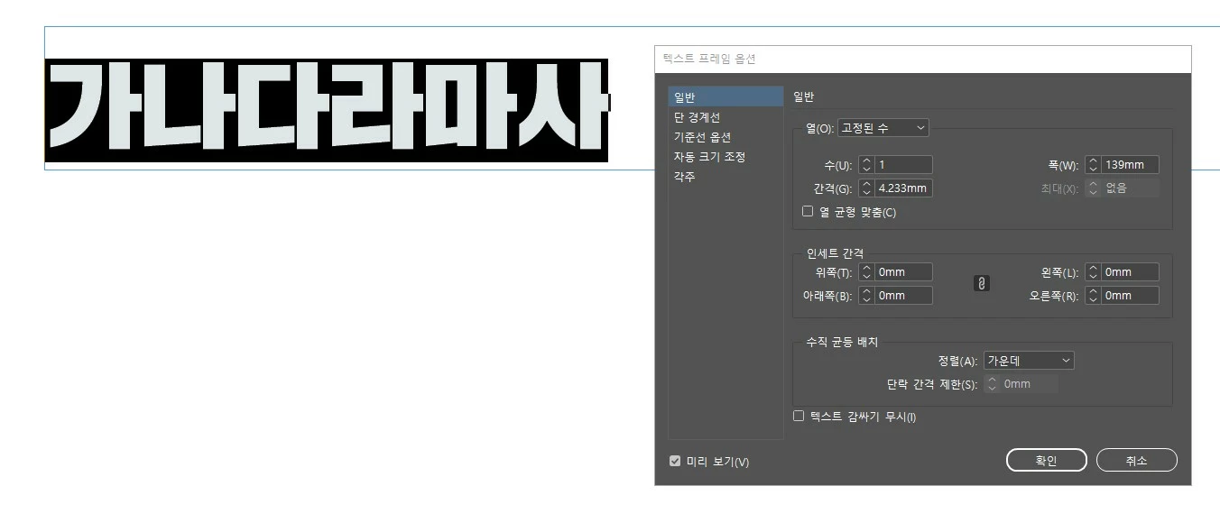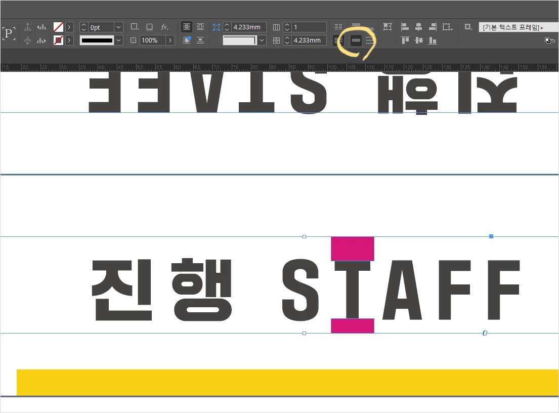 텍스트 프레임을 중간정렬하면 가운데에 배치되지 않고 살짝 아래쪽으로 배치되는 등 딱 중간에 정렬이 되지 않습니다. 해결방법이 있을까요?