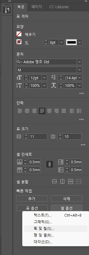 인디자인에서는 아직 셀이 있는 빈칸이 표시가 되지만