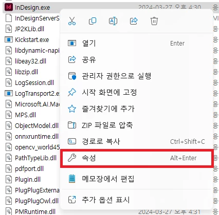 • InDesign.exe 파일을 찾아, 우클릭 후 속성 메뉴를 선택합니다.