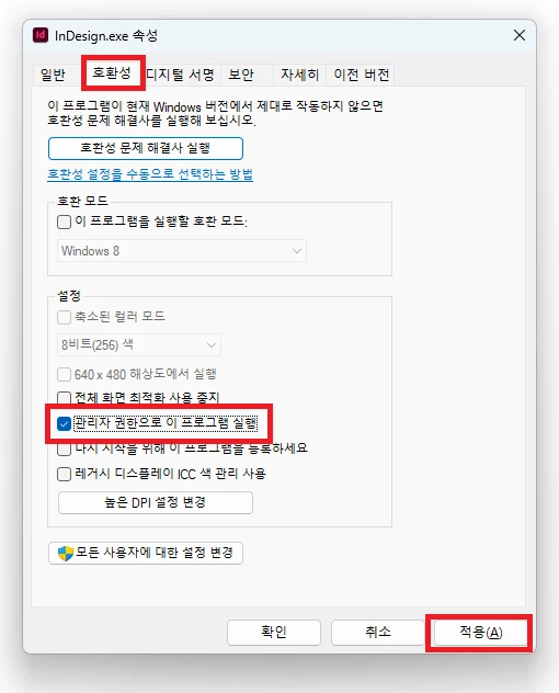 • 호환성 탭에서 "관리자 권한으로 이 프로그램 실행"에 체크 후 적용 눌러주세요!
