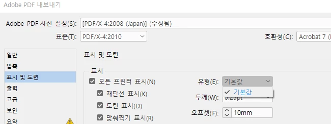 pdf내보내기를 할 때 맞춰찍기 표시 중 J표시, 원모양 표시가 보이지 않습니다.